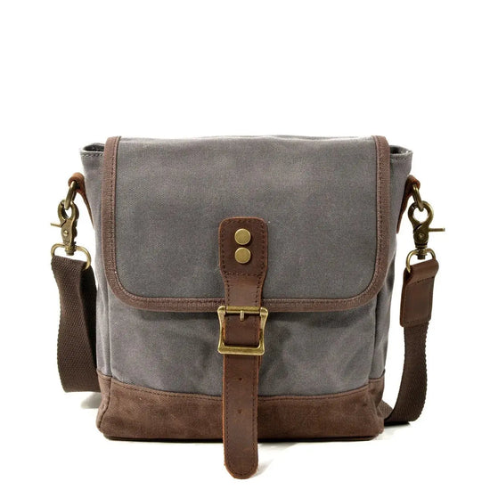 Sac bandoulière homme compact en toile cirée grise avec détails en cuir vintage