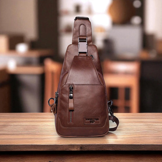 Sac de poitrine homme en cuir marron avec bandoulière ajustable et multiples poches
