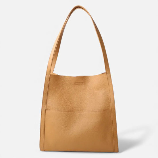 Vue de face du sac cabas en cuir véritable marron clair posé sur fond clair, avec ses anses souples visibles.