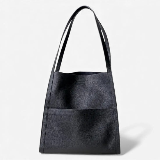 Vue de face du sac cabas en cuir véritable noir avec texture grainée et anses souples assorties.