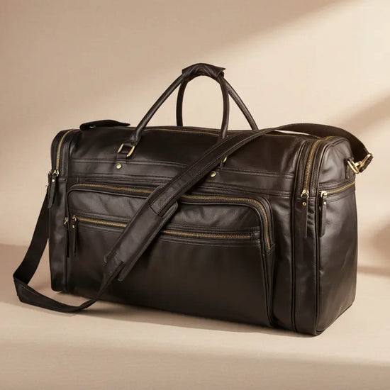 Ce sac de voyage en cuir de vachette pleine fleur noir associe élégance intemporelle, volume généreux et finitions premium. Avec sa double anse renforcée, sa bandoulière ajustable et ses multiples compartiments zippés, il répond aux besoins des voyageurs exigeants. Un allié idéal pour les déplacements professionnels, week-ends prolongés ou voyages longue durée.