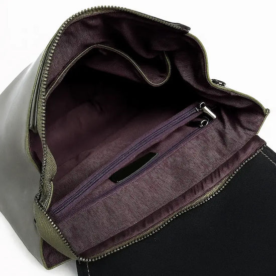 Intérieur du sac à dos femme en cuir de vachette vert avec doublure en polyester et poche zippée