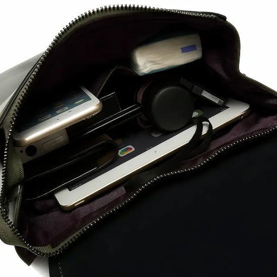 Intérieur du sac à dos femme en cuir de vachette vert avec accessoires rangés