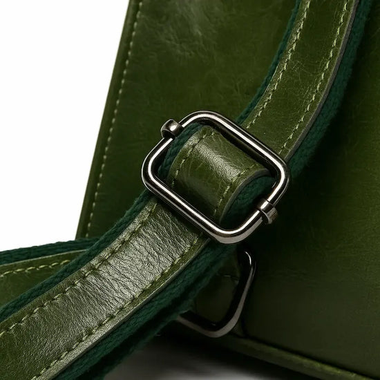 Zoom sur boucle métallique des bretelles du sac à dos femme en cuir de vachette vert