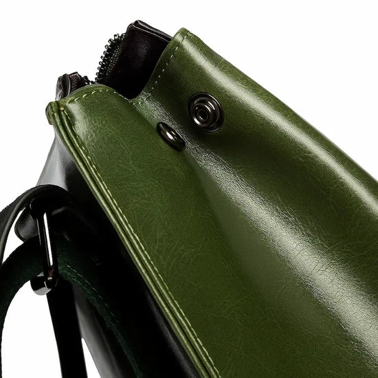 Sac à dos femme en cuir de vachette vert ciré avec rabat arrondi style vintage