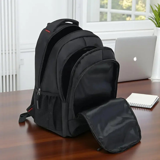 Ce sac à dos de grande capacité est pensé pour ceux qui ont besoin de transporter l'essentiel au quotidien. Son design moderne et sportif , ses multiples compartiments , ses poches zippées sécurisées et son système de portage ergonomique en font un allié parfait pour les étudiants , les professionnels ou les voyageurs . Fabriqué en Oxford résistant avec une doublure en polyester , il résiste à l'usure et garde vos affaires en sécurité. Son style discret, en noir avec finitions rouges , convient aussi bien à un usage urbain que scolaire.