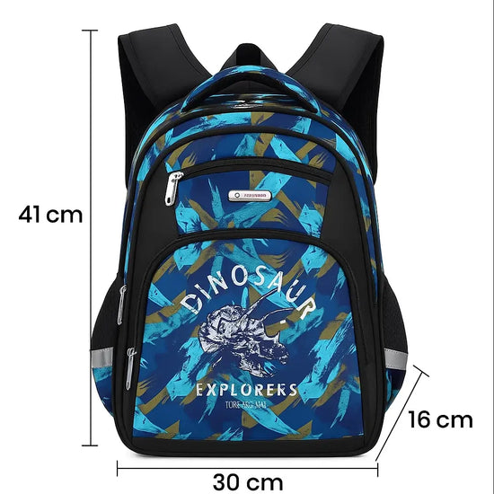 Sac à dos ergonomique bleu à motif dinosaure avec dimensions 41 × 30 × 16 cm affichées.