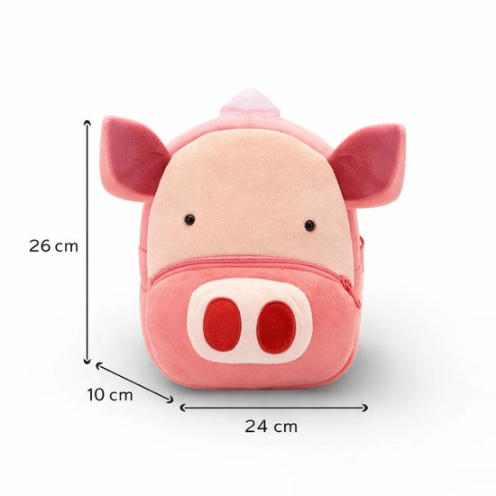 Vue avant du sac à dos maternelle en peluche rose cochon avec dimensions