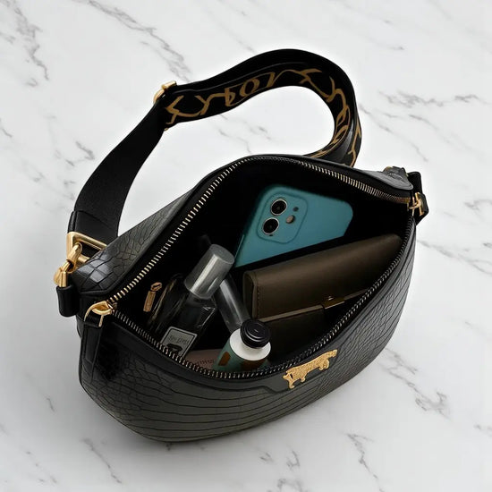 Ce sac banane femme motif croco allie élégance et praticité. Son format compact mais structuré permet de garder vos essentiels (téléphone, clés, porte-carte) toujours à portée de main. Sa chaîne dorée tendance et sa ceinture ajustable apportent confort et style, que vous le portiez à la taille, en bandoulière ou en sac de poitrine. Disponible en plusieurs coloris, il s’impose comme l’accessoire polyvalent et raffiné pour sublimer toutes vos tenues.