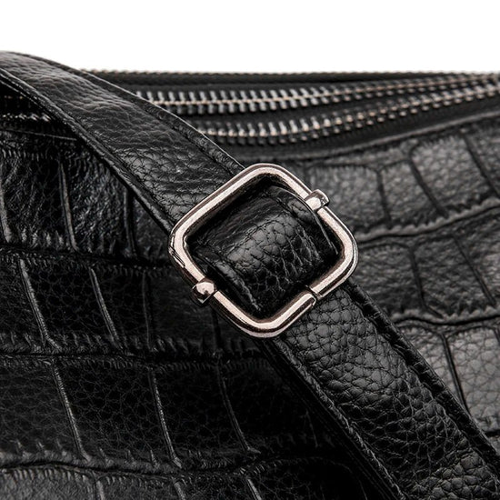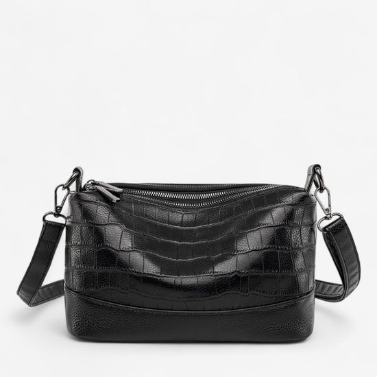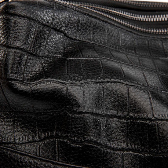 Trois fermetures éclairs robustes sur sac bandoulière cuir noir façon croco