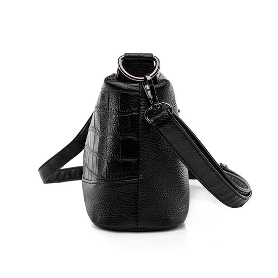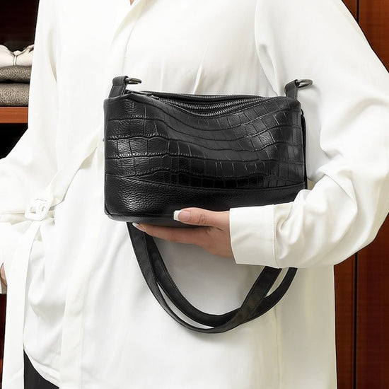 Sac bandoulière en cuir noir façon croco porté à la main avec bandoulière ajustable